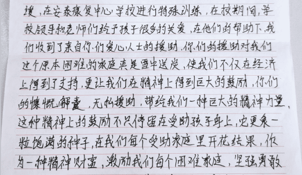 近日,领航·安泰儿童康复中心连续收到四封来自星星家长们的感谢信,他们在信中不约而同地感谢了同一对象:来自北京的爱心人士陈女士以及陈女士所在的人大校友合唱团。 部分内容如下: 虽然未曾谋面,是您的爱心让我们有所交集。曾经生活一度让我失去勇气,是社会各界爱心人……