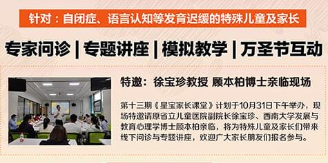 为提高特殊儿童家庭教育水平,加强家校沟通合作,丰富家长技能,形成教育合力,由安泰志愿服务队主办的第十三期《星宝家长课堂》计划于10月31日下午举办,现场特邀请原省立儿童医院副院长徐宝珍、西南大学发展与教育心理学博士顾本柏亲临,将特殊儿童及家长们带来线下问诊与专题讲座,欢迎广大家长朋友们报名参与。 ……